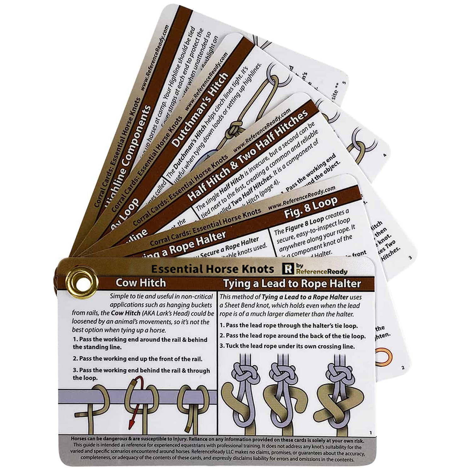 A portable, waterproof reference guide for equestrian enthusiasts featuring 19 essential horse riding, packing, and camping knots. Printed on ultra-durable plastic so it will not be damaged by mud, dirt, or moisture. Perfect for trail riders, horse packers, and anyone working with equines. Includes a mini carabiner.