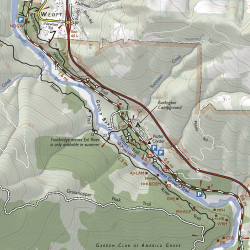 For the third edition, the trails were updated with new, more accurate GPS data. The rebuilt trails on the west side of the Eel River are now shown, and maps of Grizzly Creek Redwoods, Van Duzen County Park, and Standish-Hickey State Park have been added. Wooded and developed areas have been redrawn at a higher resolution and the hillshade has been re-rendered to give a better impression of the area’s large-scale topography.