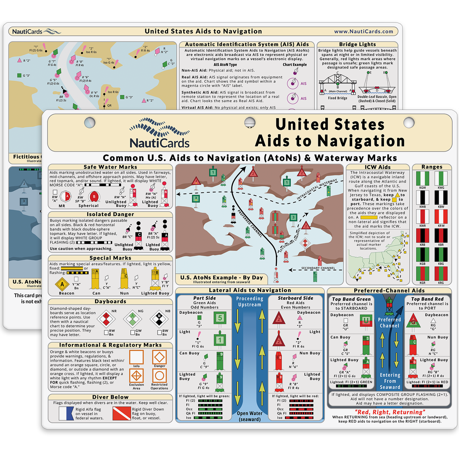 A waterproof, full-color reference card providing a complete visual overview of the U.S. Aids to Navigation (AtoN) system. Covers lateral and non-lateral buoys, preferred channel aids, safe water marks, light rhythms, dayboards, regulatory marks, bridge lights, and ICW aids based on current U.S. Coast Guard standards. Shows how aids appear on charts vs. in real-world conditions. Pre-punched for binder or cockpit mounting.